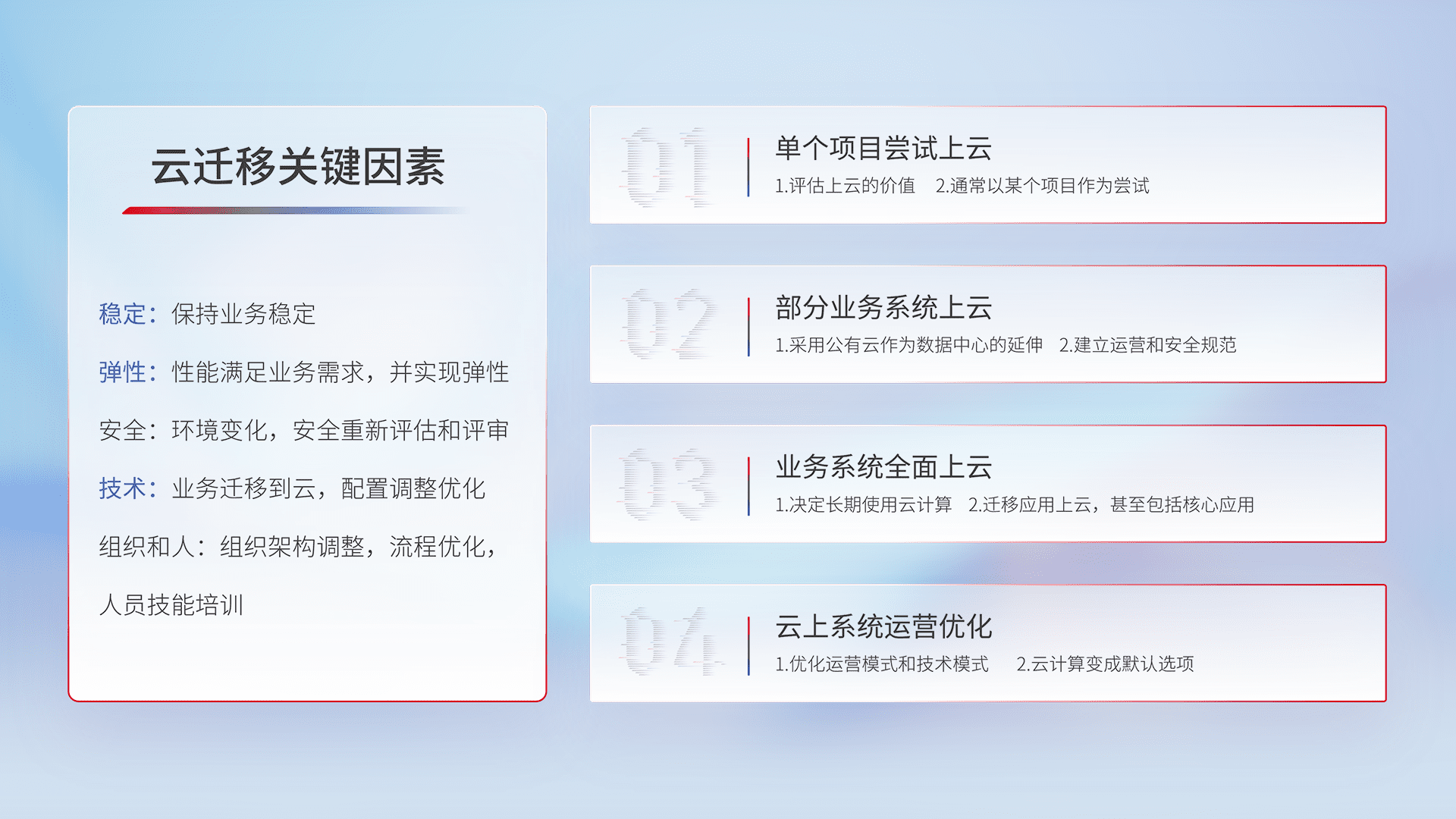 结合实际业务,,,,从规划设计、、、云平台选型、、、云原生改造、、、数据迁移、、、、集成交付,,,迁移全过程为客户识别最佳上云路径,,做好风险识别管理,,设计网络架构、、身份权限、、安全审计合规、、、、操作审计、、、、日志审计、、、、监控告警策略、、多站点容灾设计等,,,对云上基础设施进行整体规划,,,提升IT治理水平,,,,以满足弹性、、高可用、、、、高性能的需求。。。