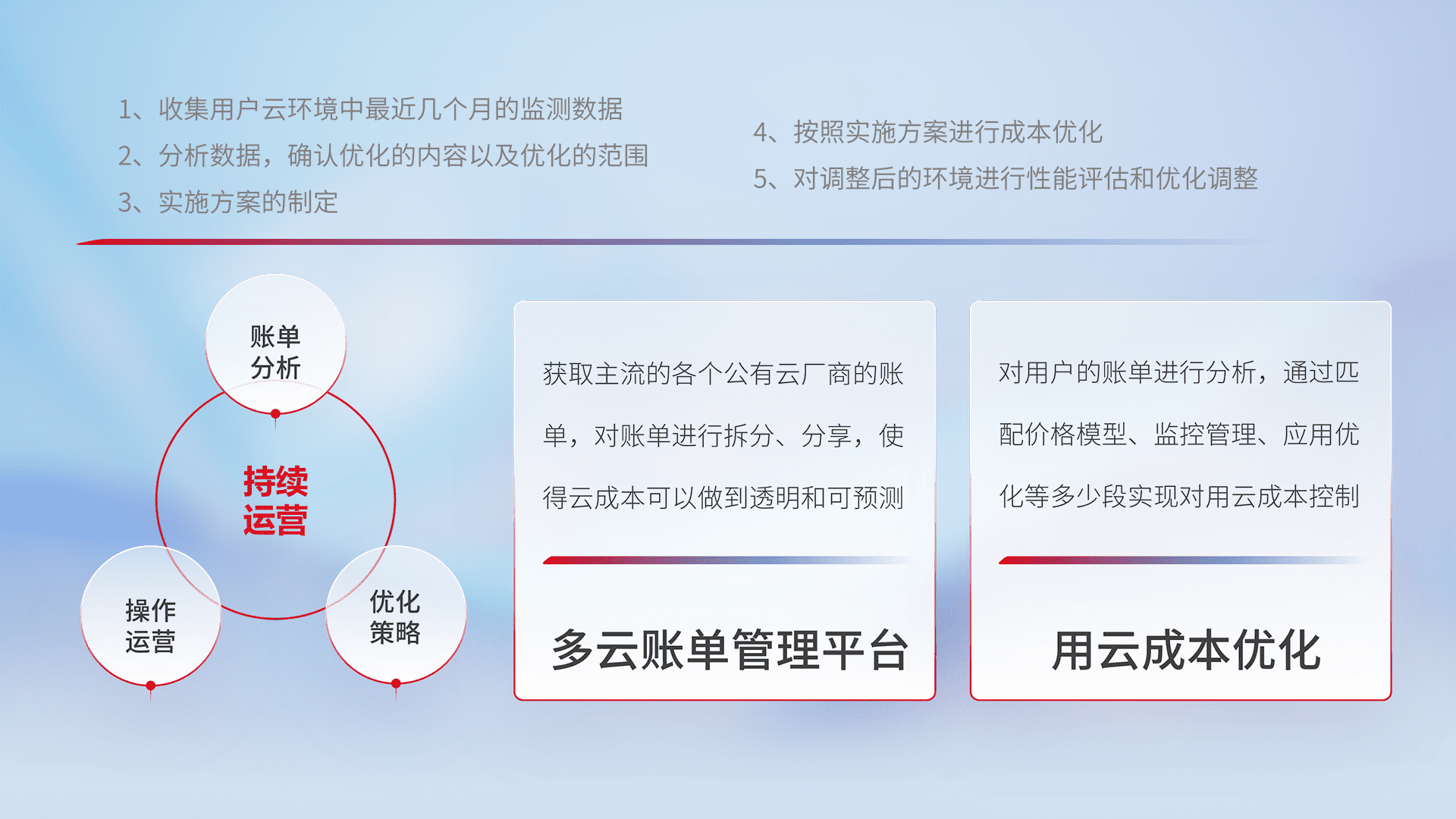 通过多云纳管,,,,以统一的资源数据模型把客户的云资源进行抽象和封装,,进而实现对多云资源的统一操作,,,保障云资源管理的可靠性、、稳定性与可用性。。。。量身定制化运维内容,,配置、、、、开发运维、、、、补丁管理、、、备份、、、监控、、、认证和访问管理、、、审计和日常巡检等,,保障在用云过程中的可靠度,,,稳定度以及高可用率。。。